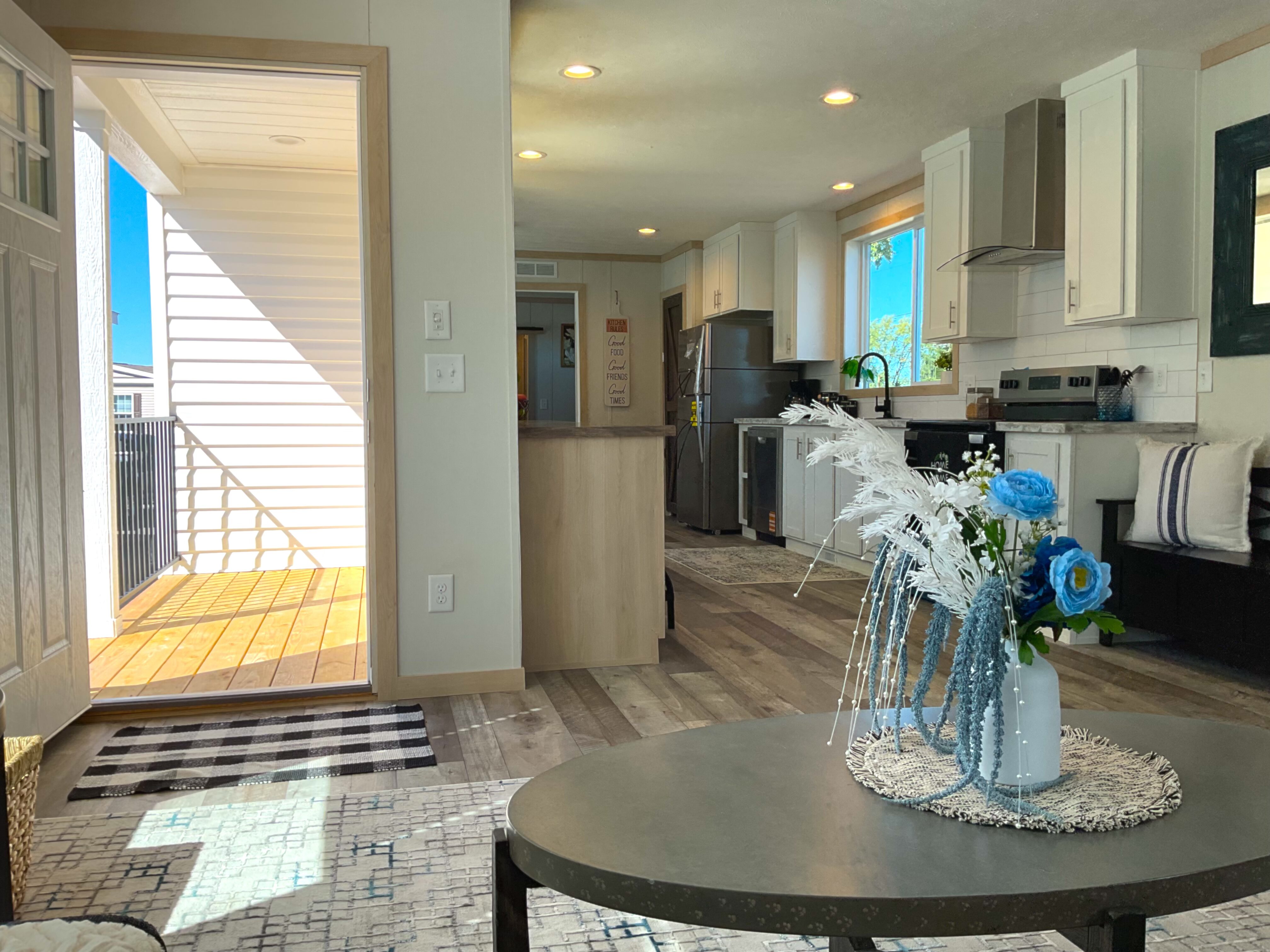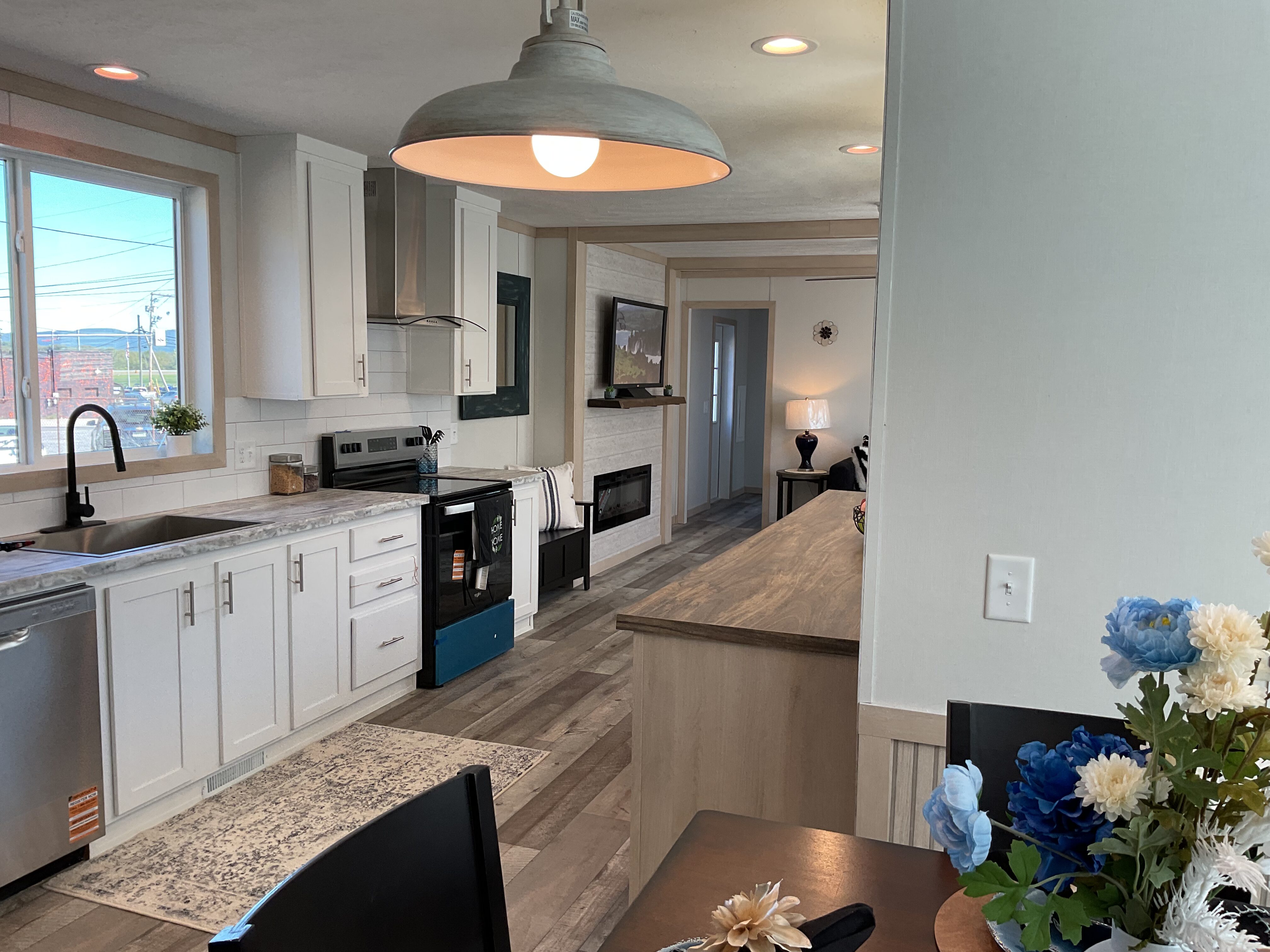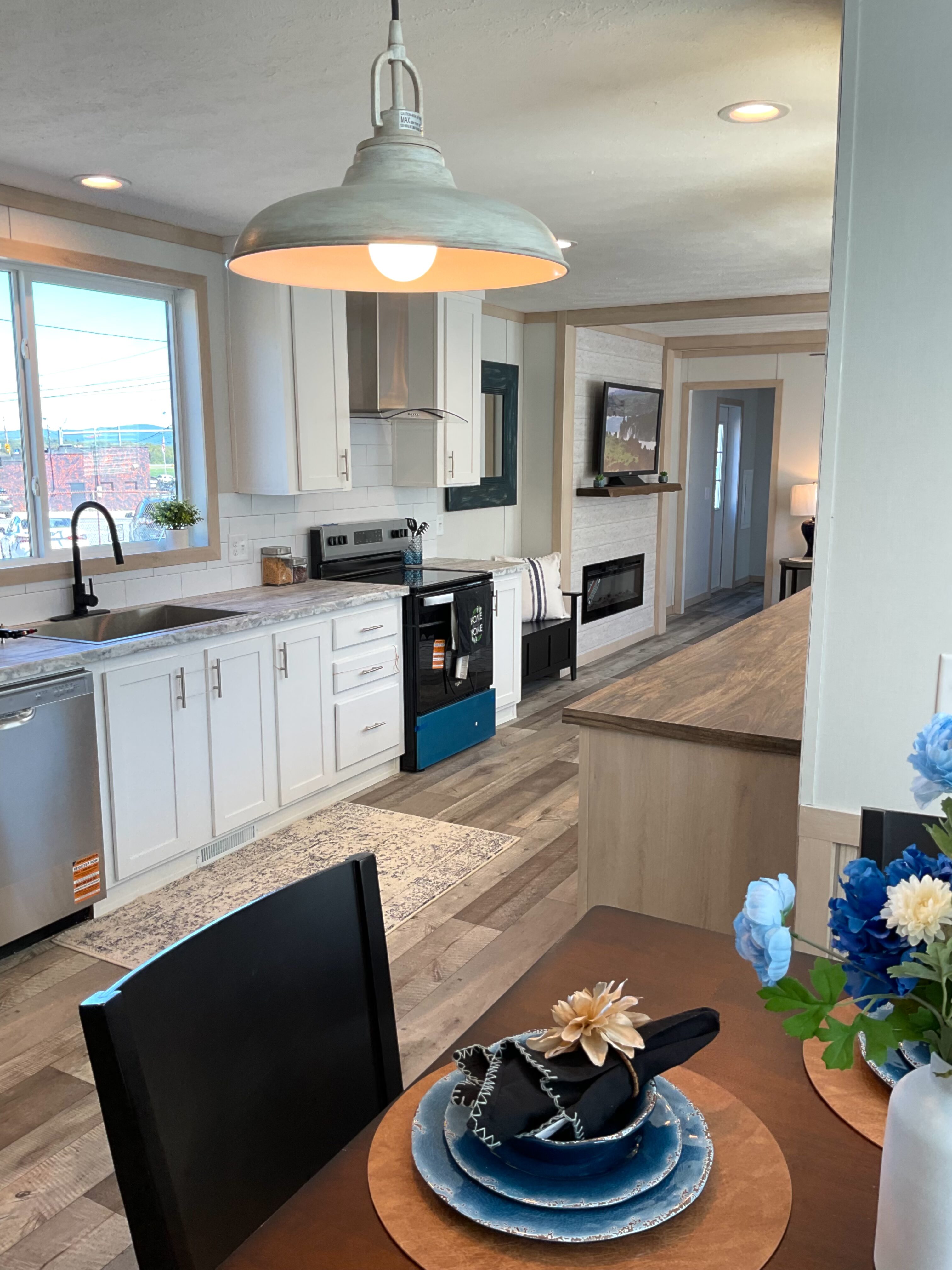 Featuring a built-in overhang porch, kitchen bar, and light-filled dining area, the Pegasus is a champion of charming simplicity. The long kitchen, adorned with rustic barnwood accents, flows directly into the main living space with built-in mantle and electric fireplace.
