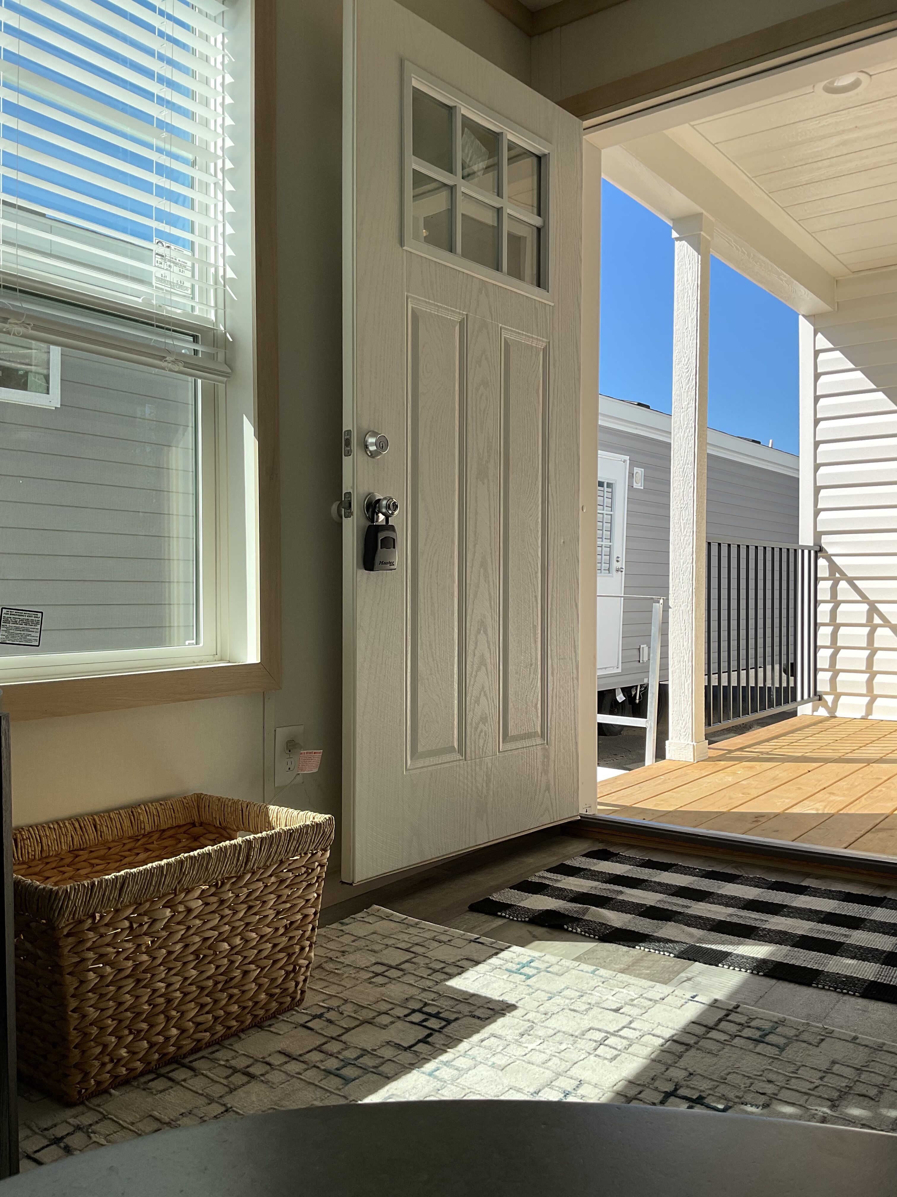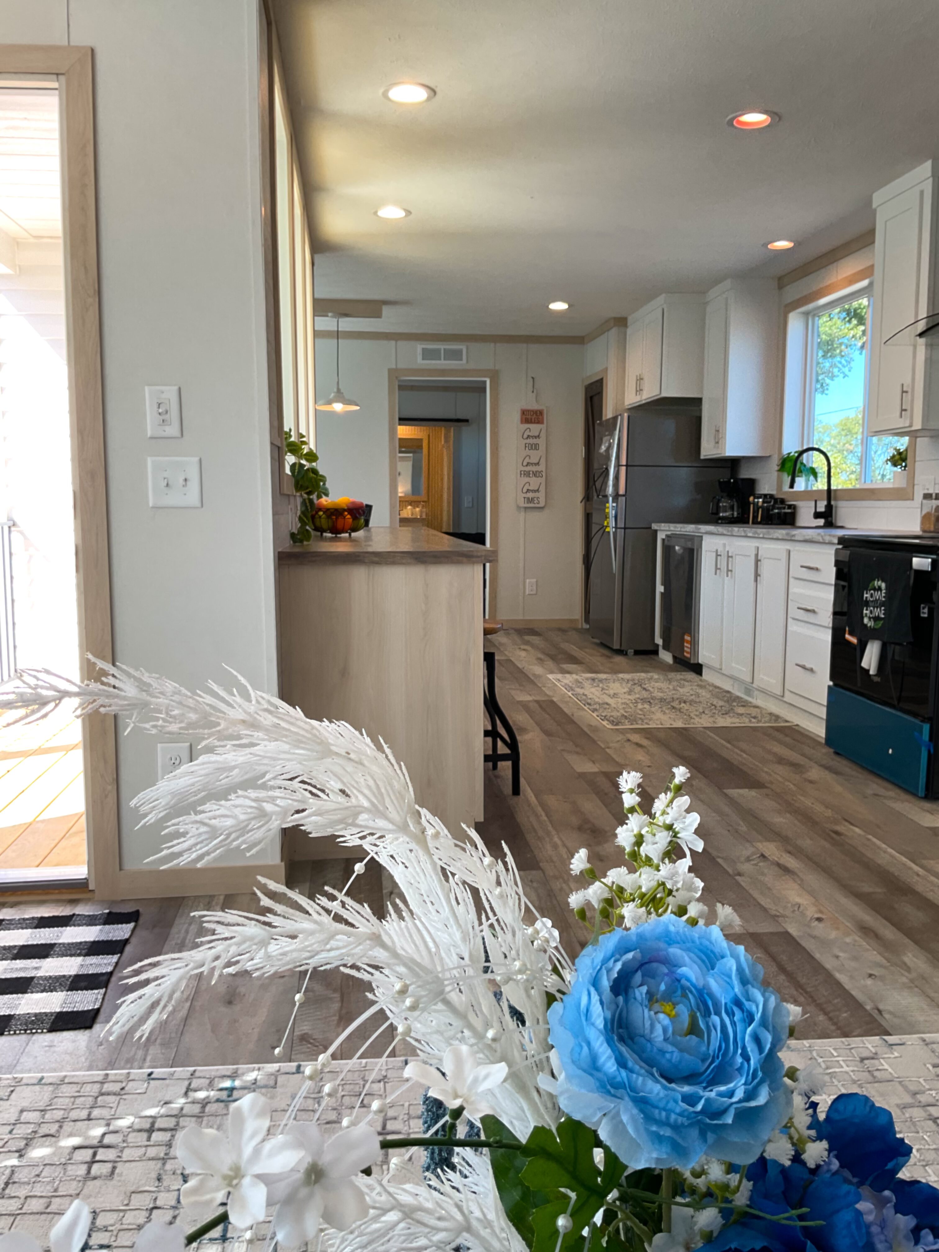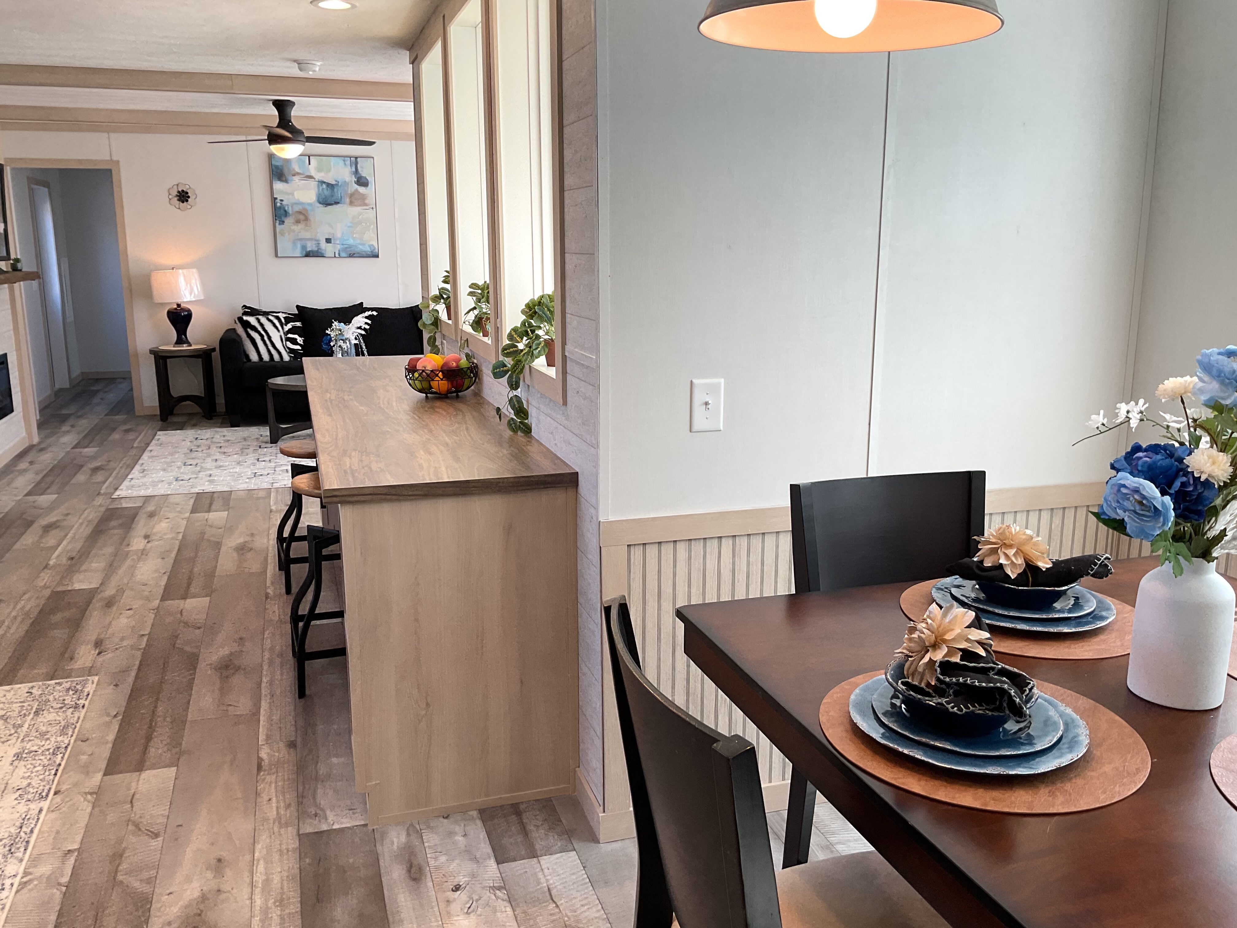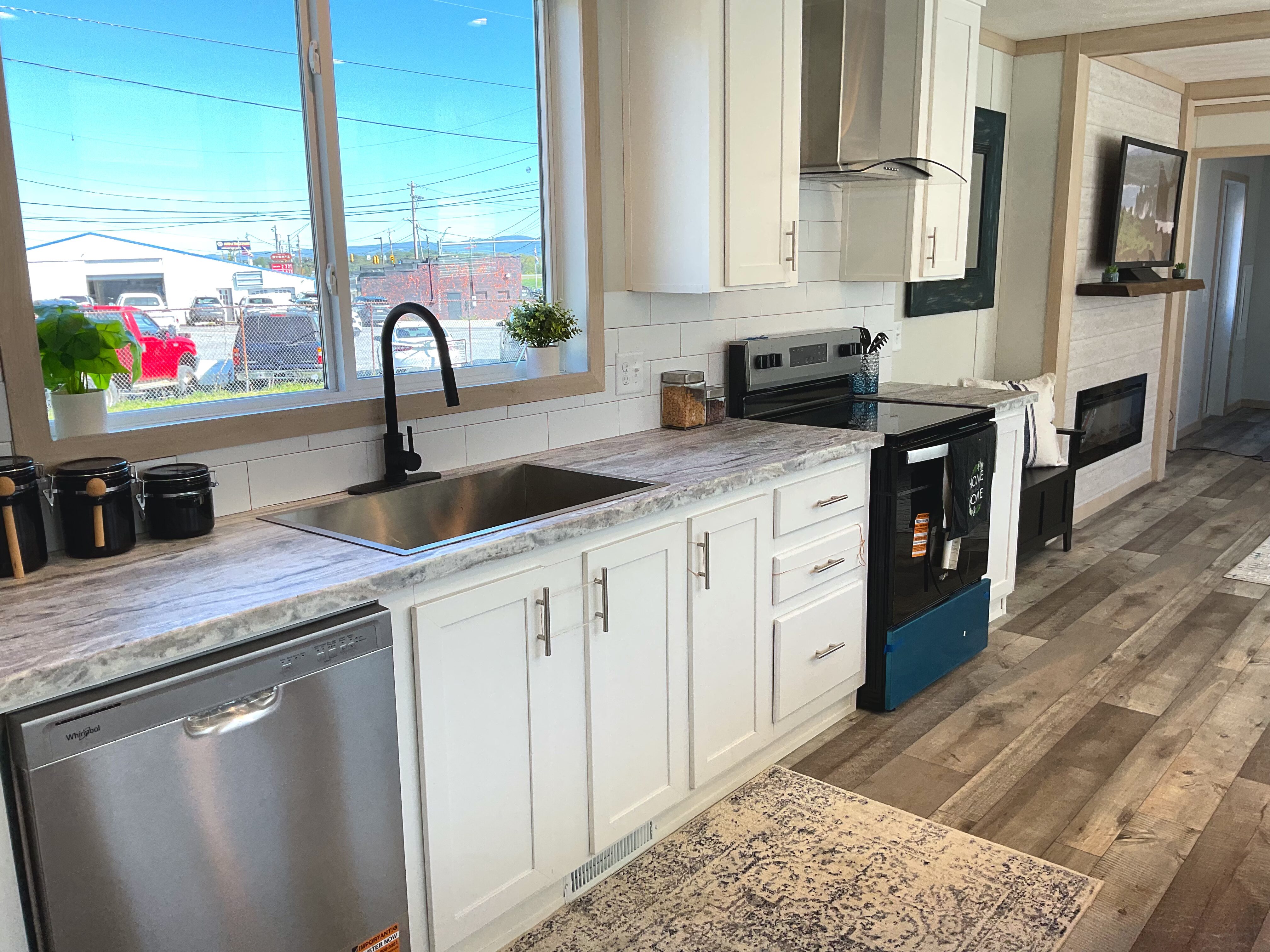 Featuring a built-in overhang porch, kitchen bar, and light-filled dining area, the Pegasus is a champion of charming simplicity. The long kitchen, adorned with rustic barnwood accents, flows directly into the main living space with built-in mantle and electric fireplace.